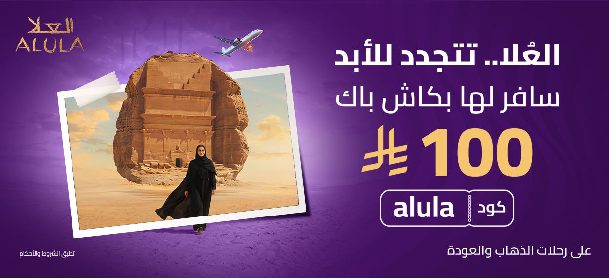 100 ريال كاش باك (كنقاط في محفظة العميل) على حجوزات الطيران الداخلي الى العلا باستخدام الكود: